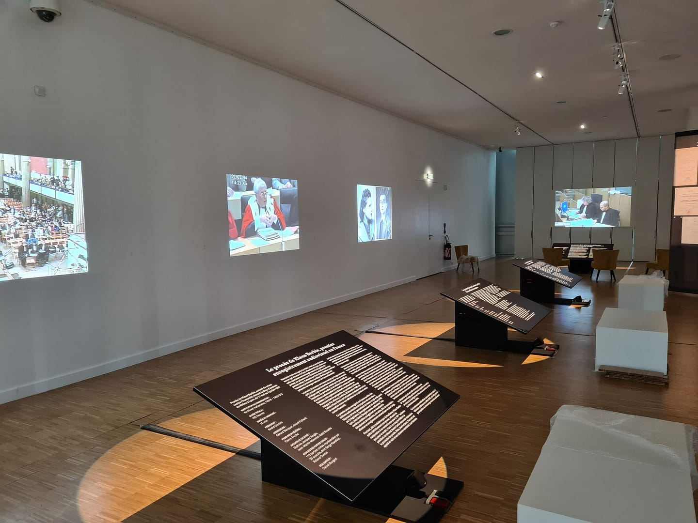 L’illustration présente un application aux archives nationales où la diffusion se fait sur vidéoprojecteur. L’interface est constitué par deux pédales.